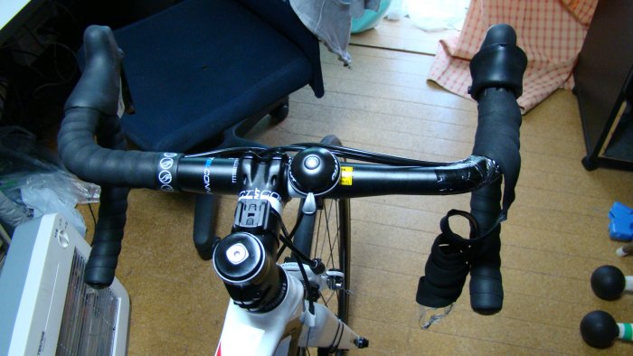 ブレーキレバーの位置を体格に合わせて、バーテープを白に張り替えます。