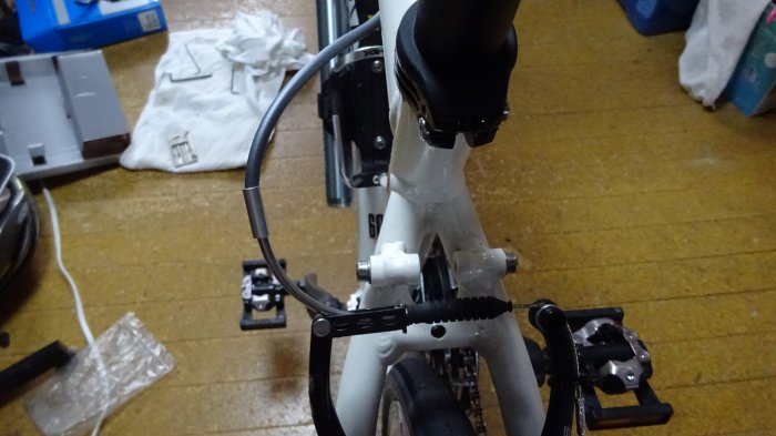 完成したと思って部屋の中で跨がって動かしてみるとブレーキが利かない。