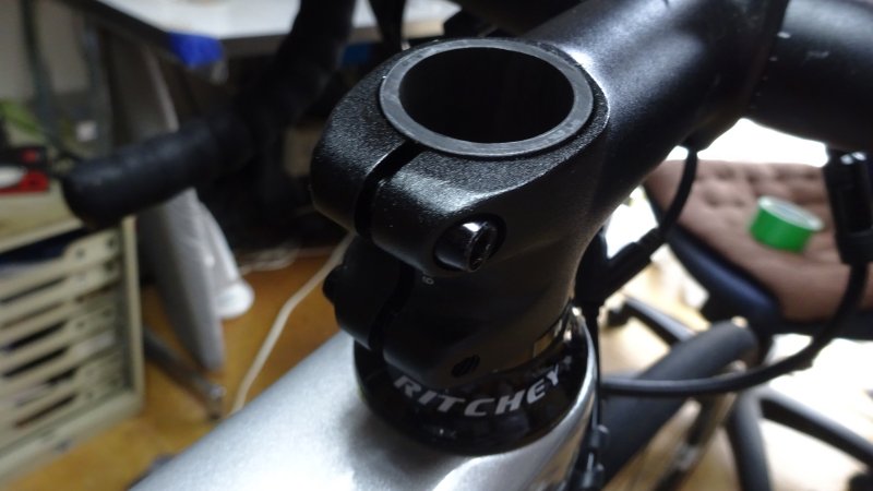 これだけ出ているのでカットします。 失敗すると面倒なので、チェーンカットとこのカットは緊張します。 いつもはフォークを外すのですが、 ディスクのホースが捻れたりするのが心配でこの状態から。 アルミと鉄と違って軽々と切れます。 ちょっと短かった。 でも、ネジで締めて引っ張るから大丈夫。 1.8cm切る筈でしたが1.9cm切ってました。 もう少し薄いスペーサーを使えばよりスマートに。
