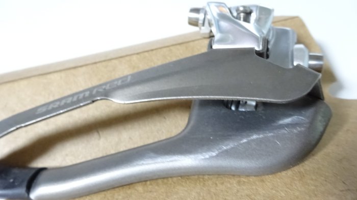 スラムAPEXのFDの動作がイマイチなので、フォースを探していましたが 最近始めたメルカリでレッドを見つけたので購入しました。 送料込みで2400円でした。 大変お得な価格です。 羽根の部分はチタン合金です。 噂では、このチタンの羽根はたわんで変速性能はよくないのだとか。 しかし、傷は少なく綺麗です。 チェーンの跡はこの程度で新品同様と言ってもいいくらいです。 取り付けた後、性能はどうかな。