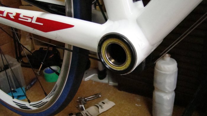 これがジャイアント規格のBB86というものか。 手前が今回導入するコンパクトクランク。 専用のグリースを使います。 チェーンは、シマノアルテグラの10Sのもの。 チェーンを交換しただけで性能はアップ、変速が以前よりスムーズに決まるようになりました。