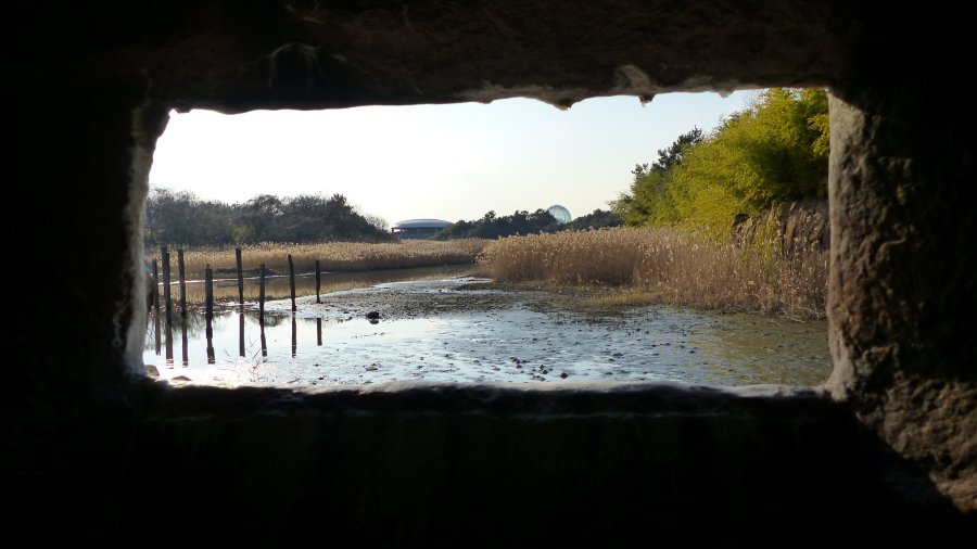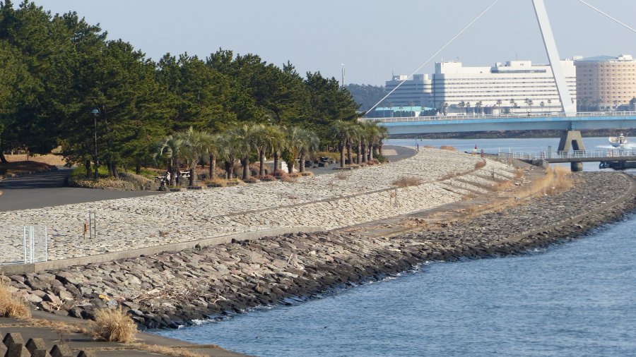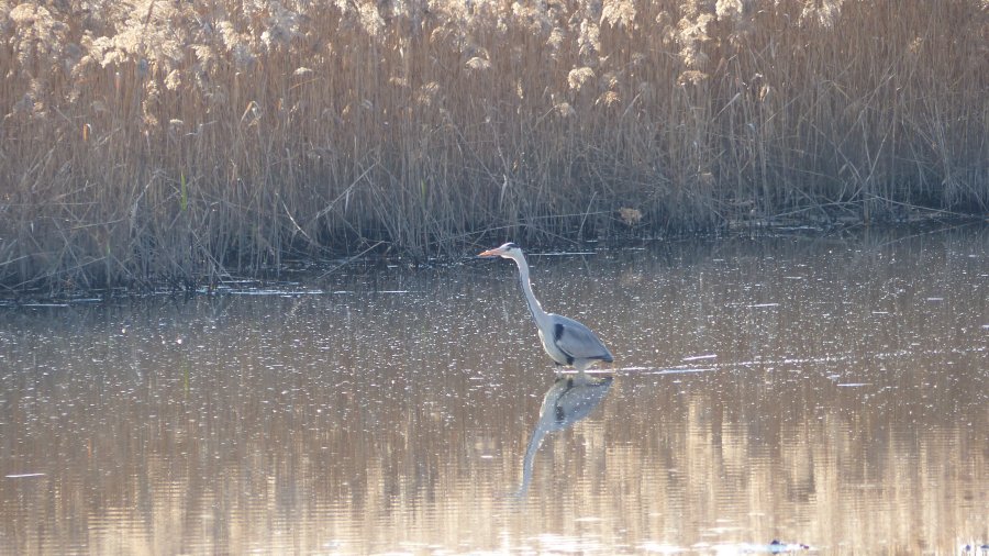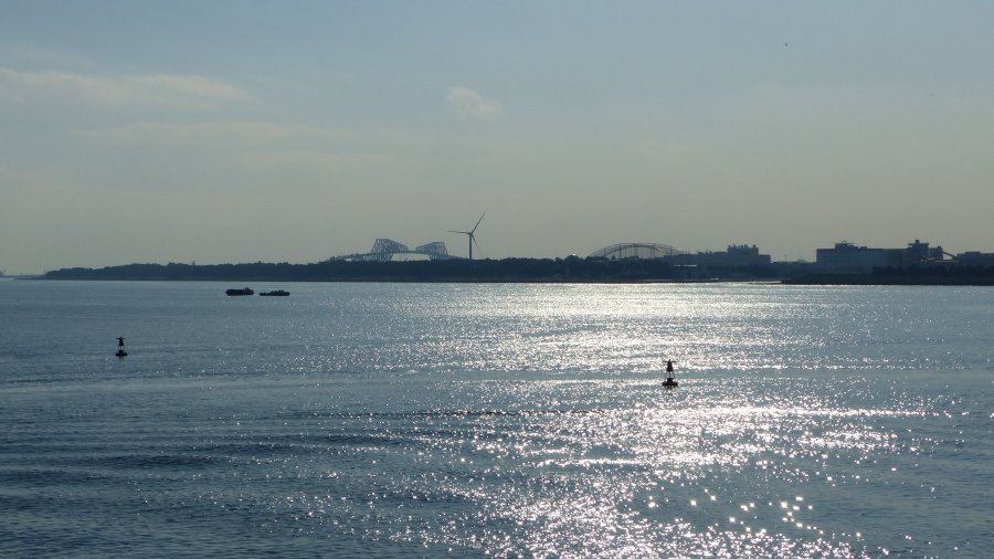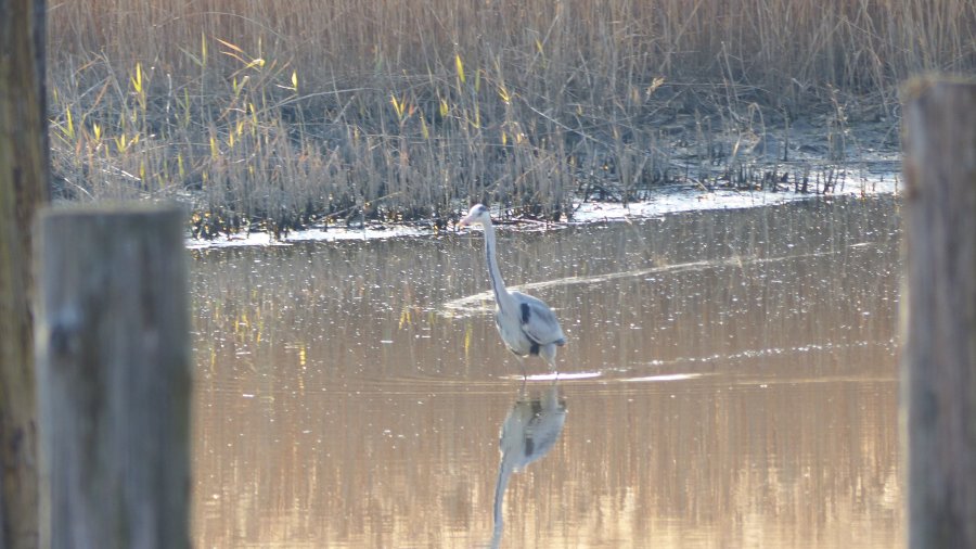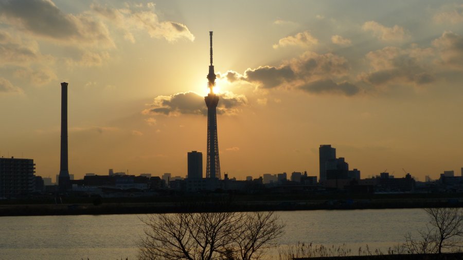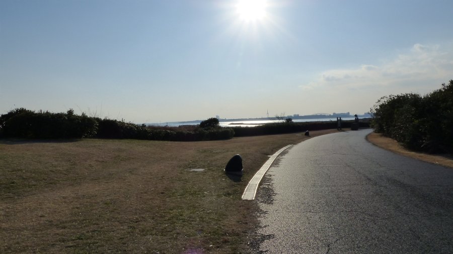 海風は暖かく春の訪れを感じました。 ( 動画 ) 葛西臨海公園には、こんな場所が幾つか在ります。 一羽もいないと思ったら。 アオサギという鳥がいました。 動 画 歩き方が面白いです。 荒川の土手の上で、カメラを構えた人が大勢いるので土手の上に上がってみました。 スカイツリー越しに見る太陽がみどころなのかな。