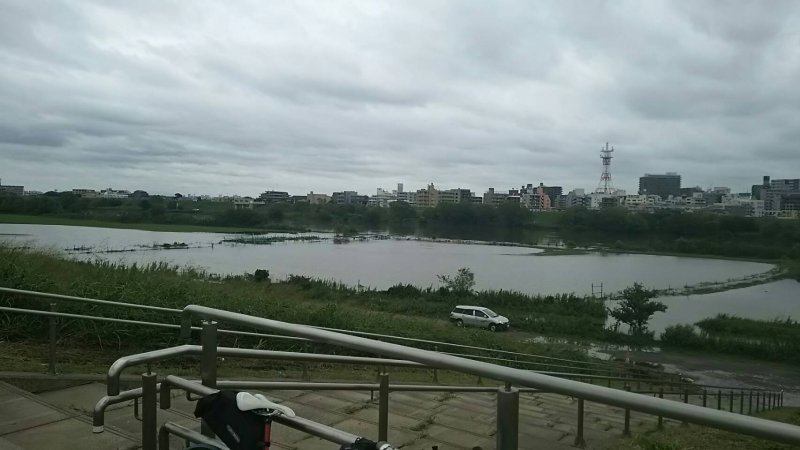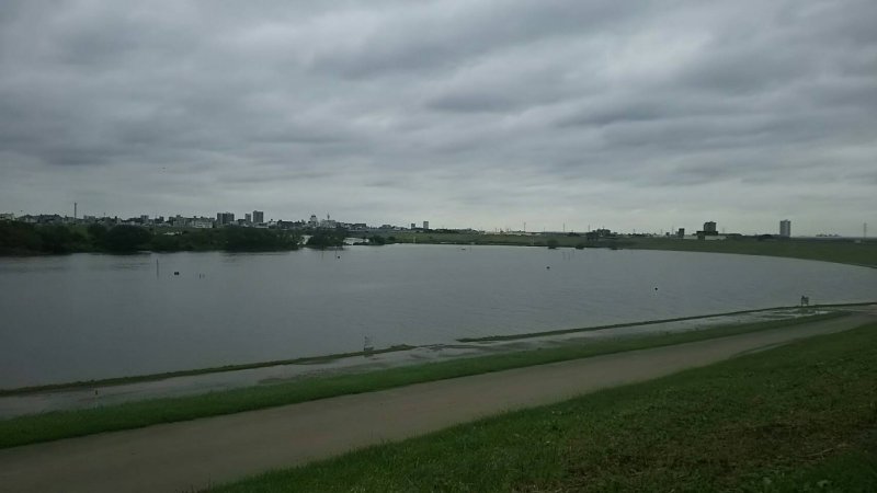 左の樹木から手前はグランドですが、川の水面と同じに。