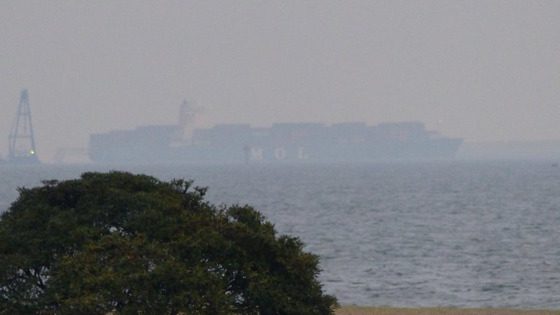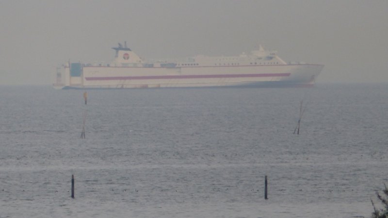 沖に空母のように巨大な船が。望遠で撮って見ると運搬船かな。