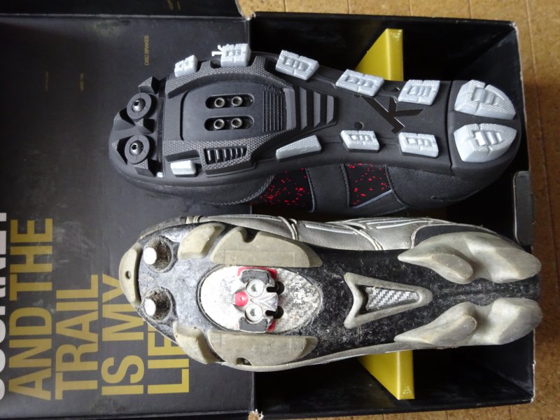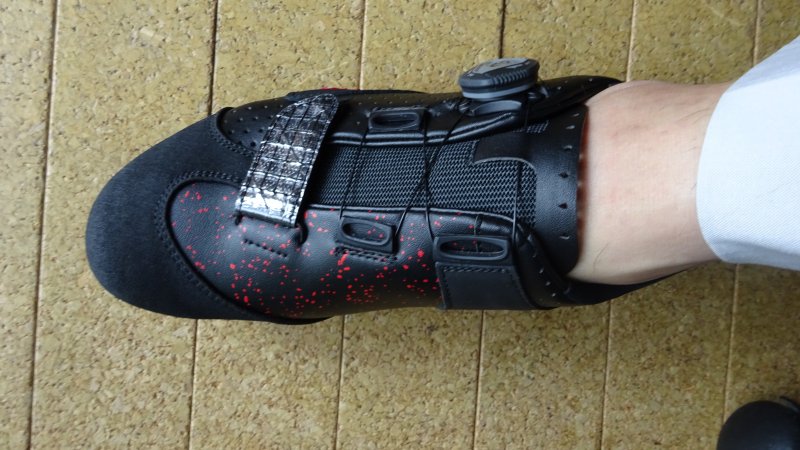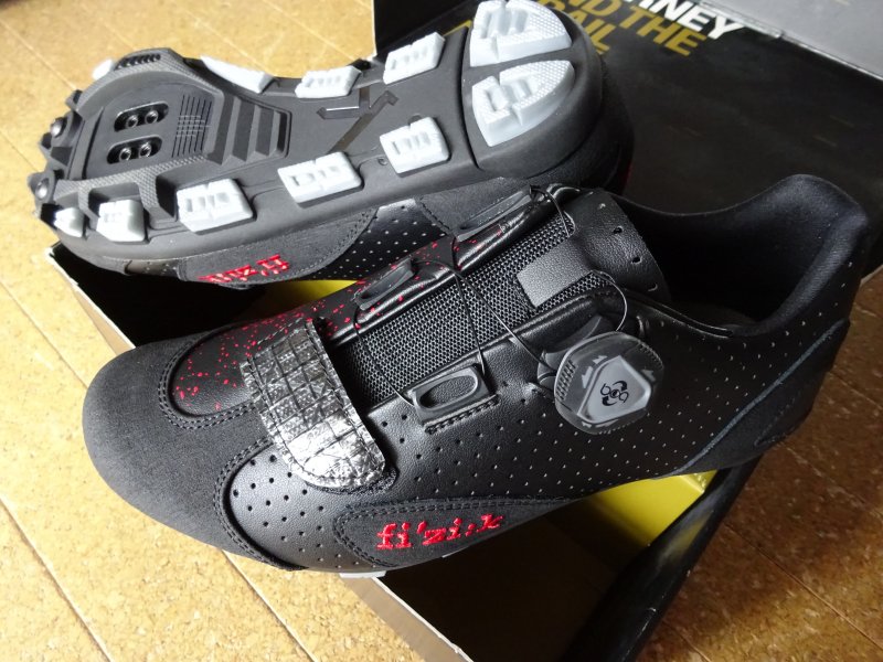 海外通販で、半額になっているシューズが。 Chain Rection cycleで。 ワイヤー式のものを使ってみたかったので。 サイズは同じですが、シマノより若干小さめかな。 今まで使っていたシマノのクリートの部分はグラスファイバー製のもの。 フィジークのものも硬いので、ロスのないペダリングができるかな。 慣れるまで?キツキツな感じではあります。