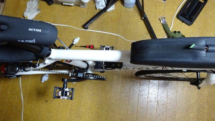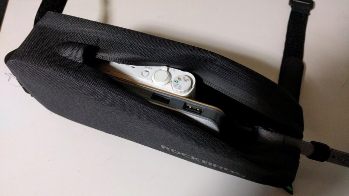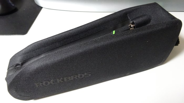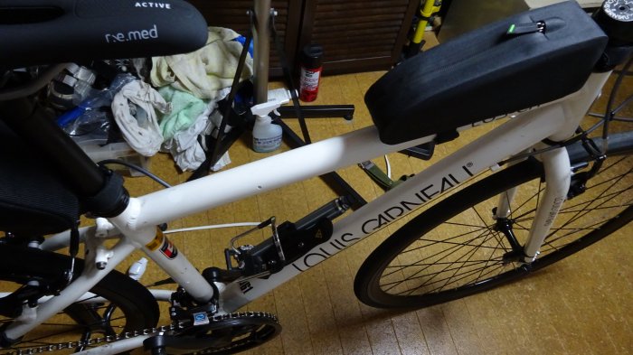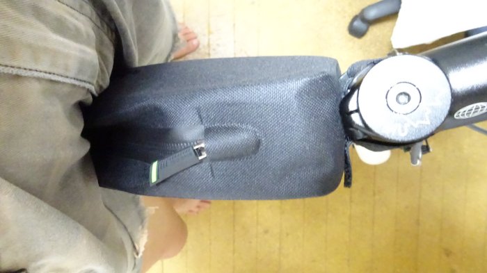 クロスバイクに取り付けるトップチューブバックをと思いアマゾンで注文。 シンプルなデザイン。 デジカメと予備バッテリーが入ります。 スマホは入らない。 トップチューブバックで問題になるのが、止まったときにお股が入る余裕があるかどうか。 ギリギリか? いや、半分潰れました。(笑) ダメかな。