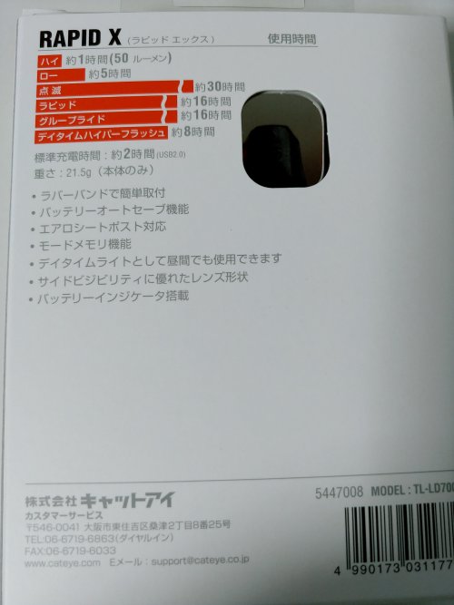 「キャットアイTL-LD700-R」 一番の候補は、TL-LD720Rだったのですが。 グループで走る場合、後を走る人が眩しすぎるとか。 評価を見て700-Rにしました。 目的としては、デイライトとしてなんですがそれでは。 部屋の中で点けてみましたが、眩しいくらい。