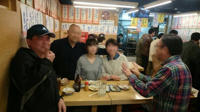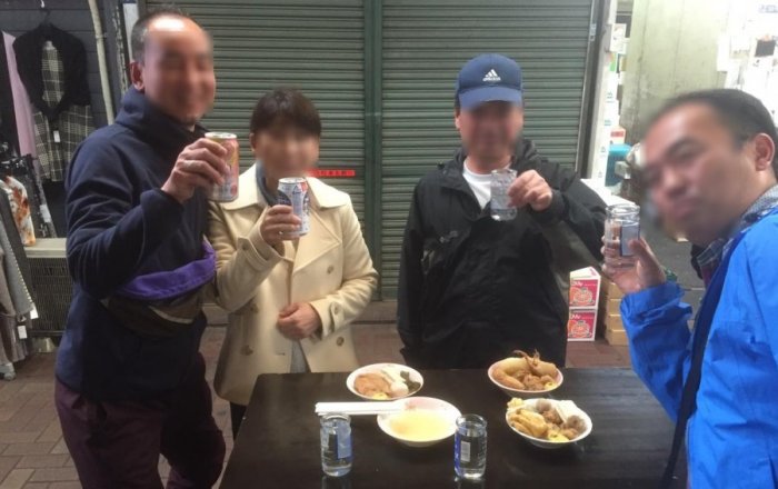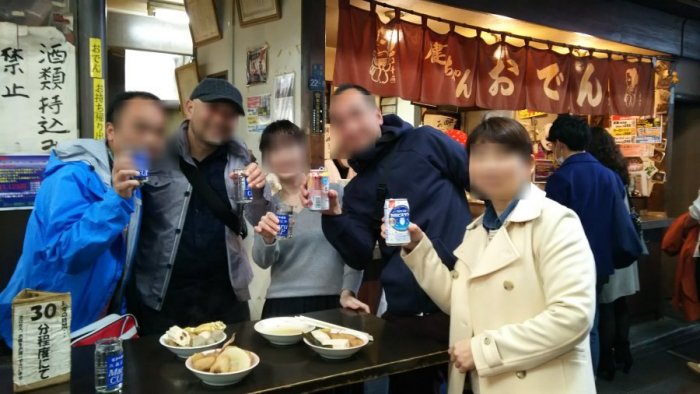 今回の昼呑みの参加者は、男性4名女性2名。 最初のお店は「立ち飲みいこい」で。 私とノアさんみやちゃん、昼間っから酔っ払ってま〜す。 次はまたおでん屋さんに。 今回の参加者、まえぴ〜さんみやちゃんノアさんマサさんnekoさん。 ワンカップを7割くらい飲んだらおでんの出汁を。七味を少し。 居酒屋に寄ってから最後はカラオケに。 今宵も程よい酔いで、胸を出す〜。