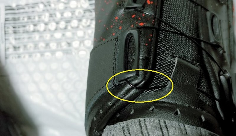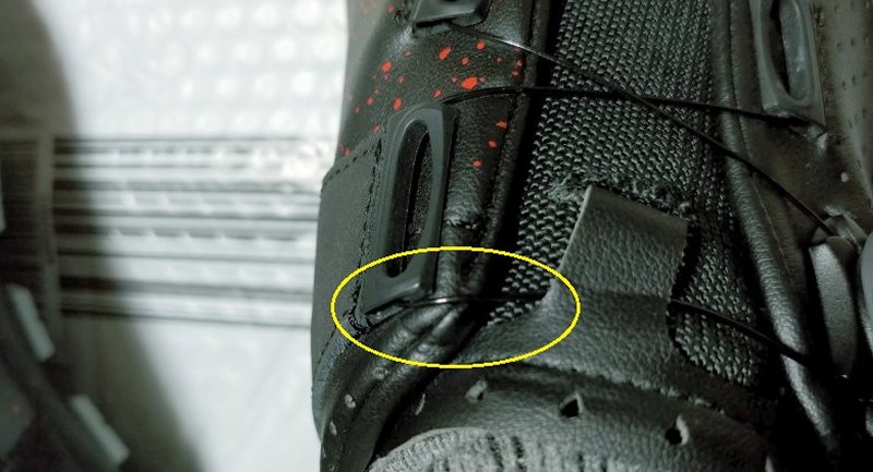 この部分が足に当たり痛かったので左右のシューズを見比べてみると。 直したあとなんですが、ワイヤーが引っかかっていて それが足の甲を圧迫していました。 これで解決かな?