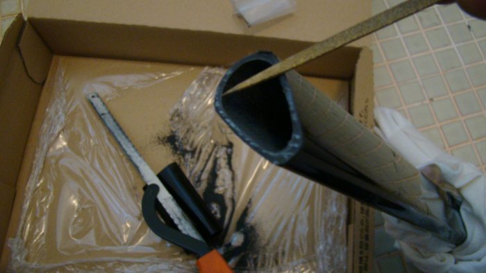 お風呂場で鉄ノコを使って切断です。
