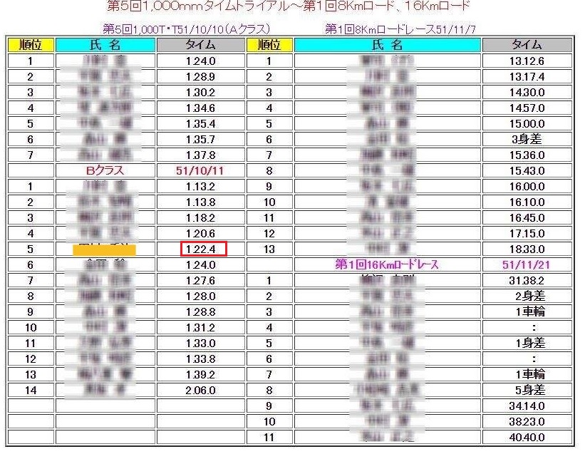 中学2年生のときに、ショップのタイムトライアルに参加したときのものです。 Bクラスで1分22秒4 になっています。 このとき、スプロケットがトップに入らなくて3速だったのを覚えています。 トップに入っていれば3位くらいになっていたと思います。 兄の、クロモリロードを借りて参加しました。 構成は、チューブラーでコンポはサンツアーサイクロン。 この頃は、競輪の選手になるのが夢でした。((笑))