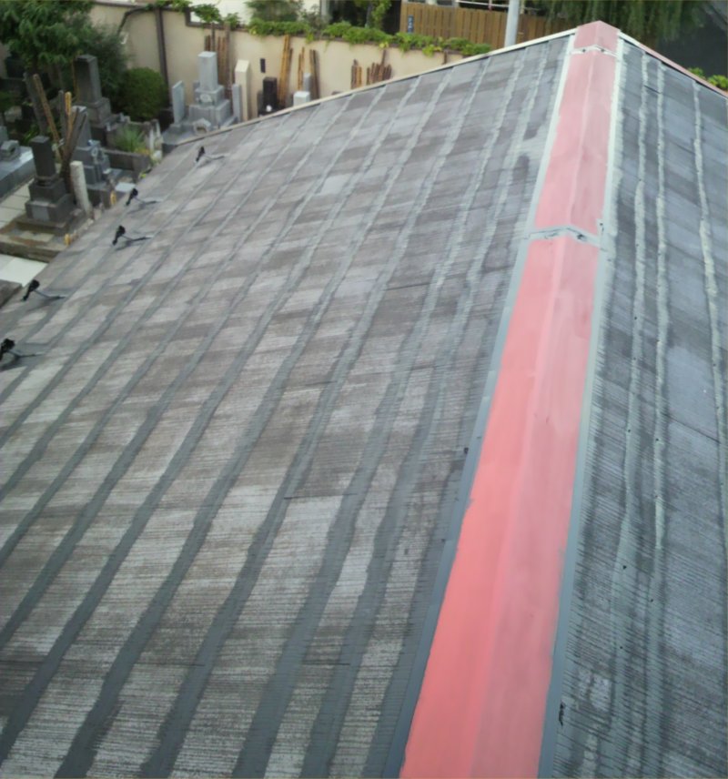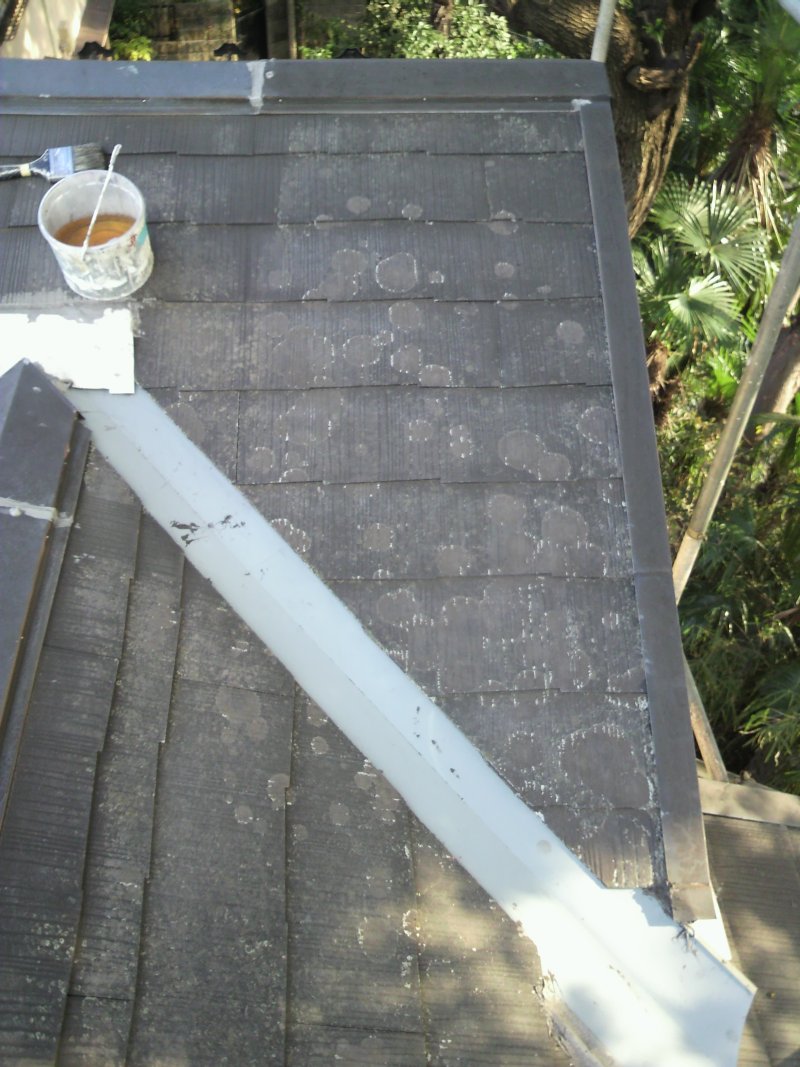 お墓の隣で、足場は掛けないでということで高圧洗浄ではなく手作業で浮いた部分と苔を落とします。 ケレン作業が終わった後、プライマーを塗ります。 鳥の糞が酷かったです。 プライマーが終わりスチールの部分に錆止めを塗ります。 錆止めが終わり上塗り作業です。段差の部分を先に刷毛で塗ります。 絶景?です。 仕上がりました。