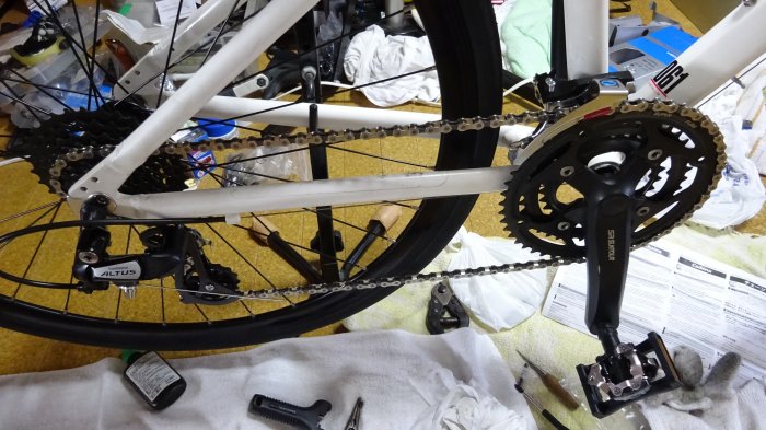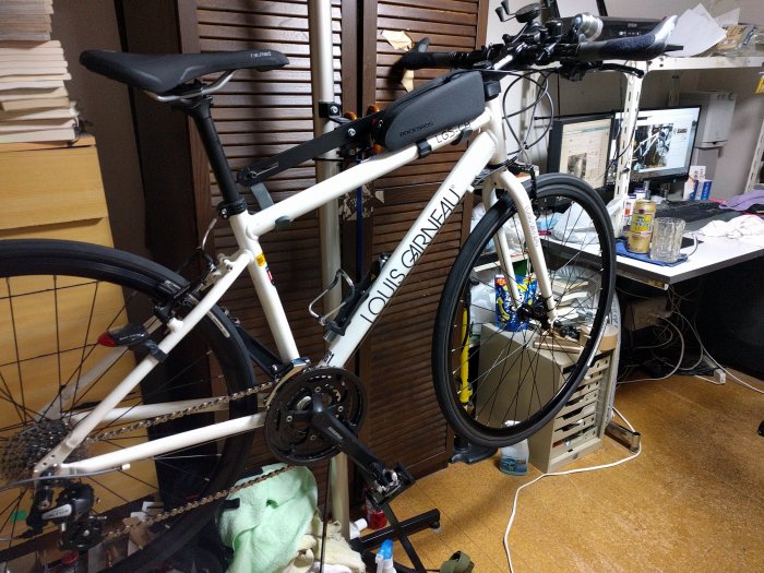 ハンドルとシフターとブレーキレバーは、前にフラットロードで使ったいた物を。