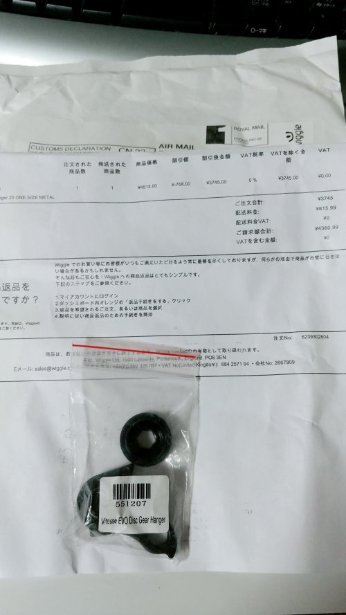 Vitusが届いたときに直ぐにディレラーハンガーを注文しました。