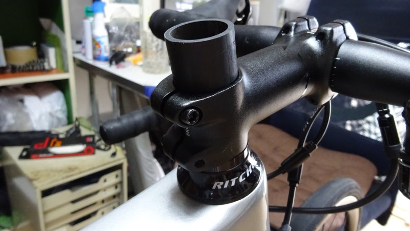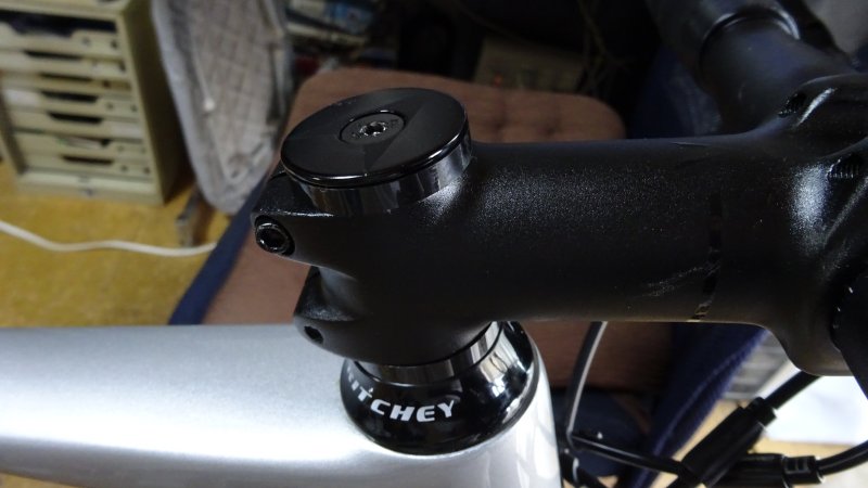 これだけ出ているのでカットします。 失敗すると面倒なので、チェーンカットとこのカットは緊張します。 いつもはフォークを外すのですが、 ディスクのホースが捻れたりするのが心配でこの状態から。 アルミと鉄と違って軽々と切れます。 ちょっと短かった。 でも、ネジで締めて引っ張るから大丈夫。 1.8cm切る筈でしたが1.9cm切ってました。 もう少し薄いスペーサーを使えばよりスマートに。