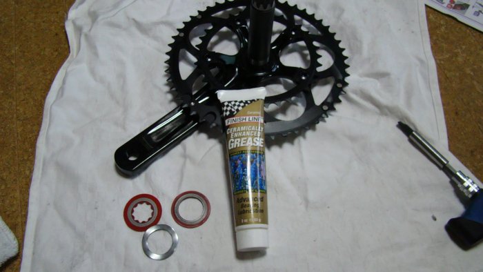 これがジャイアント規格のBB86というものか。 手前が今回導入するコンパクトクランク。 専用のグリースを使います。 チェーンは、シマノアルテグラの10Sのもの。 チェーンを交換しただけで性能はアップ、変速が以前よりスムーズに決まるようになりました。