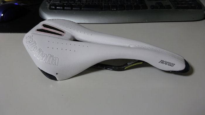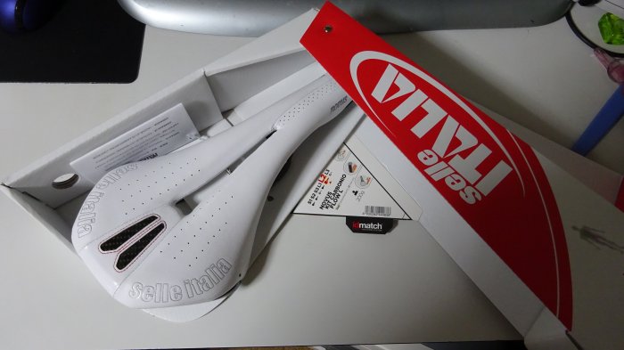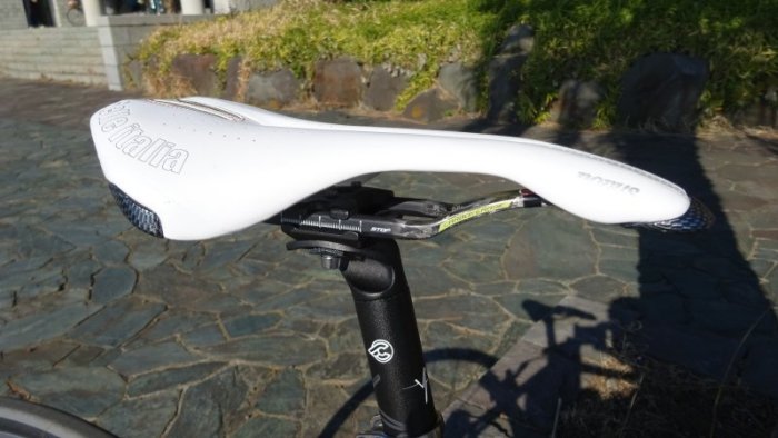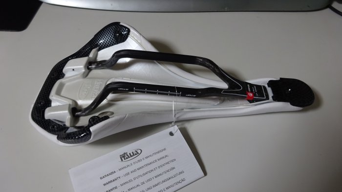 Wiggleで注文したサドルがやっと到着。 クリスマスの時期だからか、届くのに少し時間が掛かりました。 お洒落な感じに。 クッション薄い感じです。 レールはカーボン。持ってみて軽い。 以下、2017/1/3 に撮影