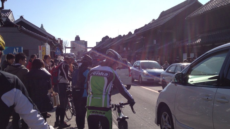 川越蔵造り通り、めちゃ混み。自転車は押して。