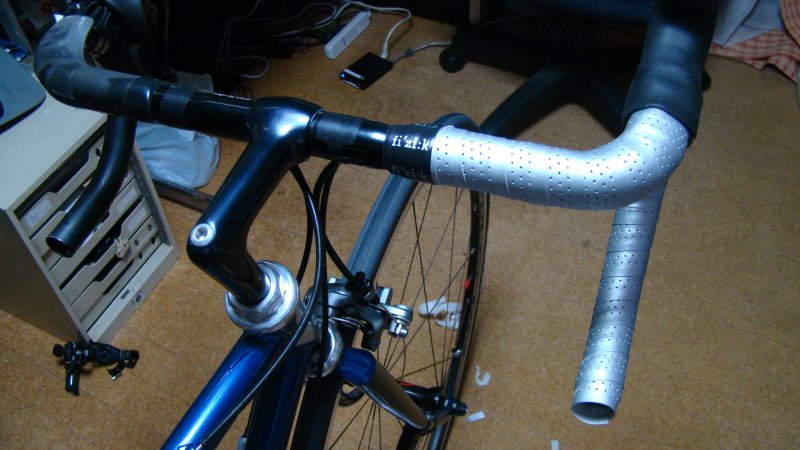 今回、乗り心地を良くするためバーテープの下にクッション材を入れることにしました。 貼ったところです。 片側を巻き終わりました。思ったより太い感じはしません。 なので?握った感じは、思ったよりクッション材入れている感じもしません。(笑)