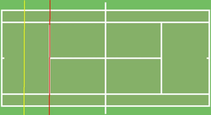 赤いラインから黄色いラインに飛んできたボールはベースライン辺りで打つ