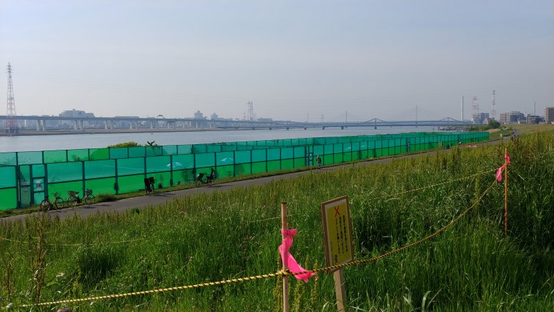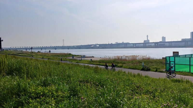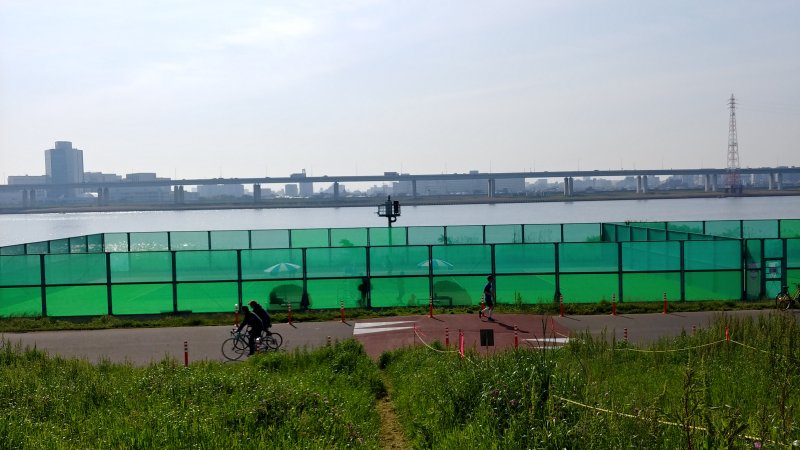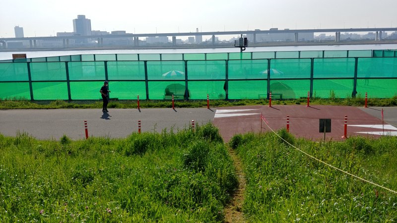 土手上から右を見ると 土手上から前を見ると 土手上から左を見ると 今日のコートでE 参加者は男性7名女性1名。 参加者の1人と話すと、スクールに通って3年だとか。 最近になってオフがあることを知り参加するようになったとか。